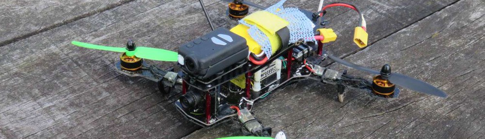 Hieronder wat ik gebruik voor het FPV vliegen: een kleine quad, zender en video bril.